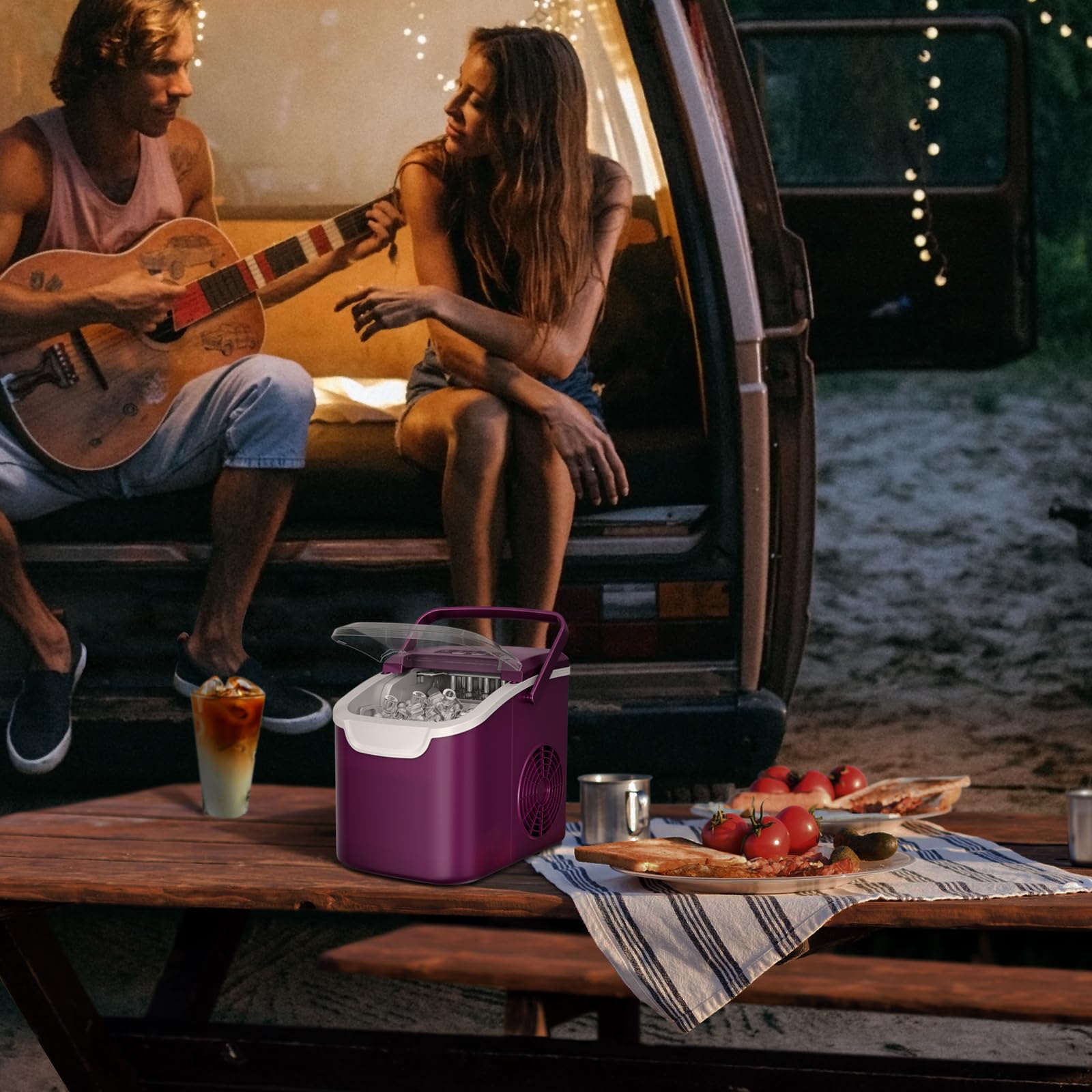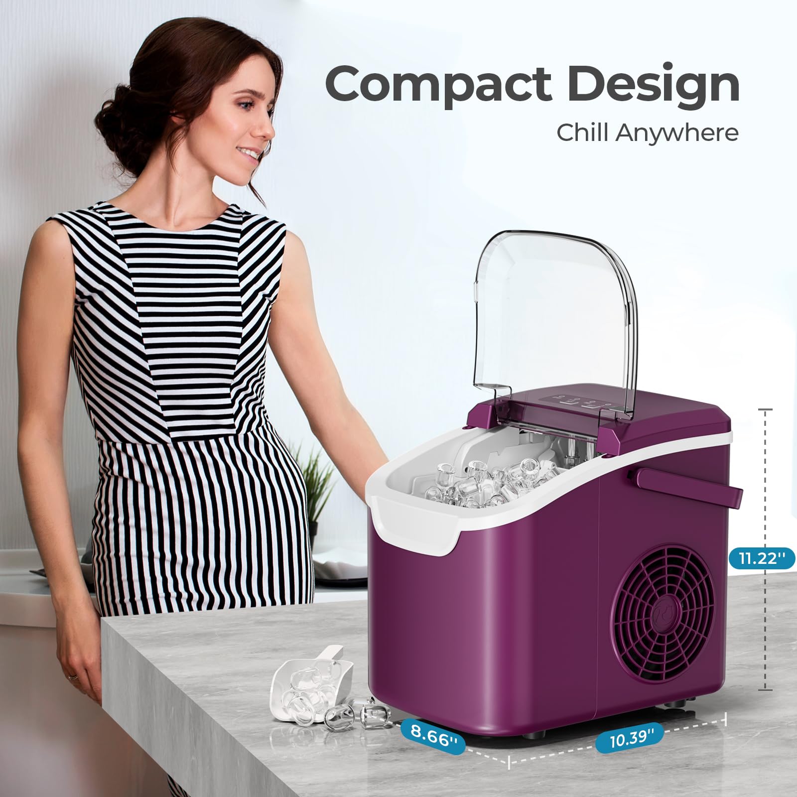 - Road Trip-Ready Compactness:Fits anywhere with 8.66"x10.39"x11.22" footprint – Throw a countertop ice maker in your RV, tailgate setup, or beach cabana. Your ultimate hydration sidekick for adventures.