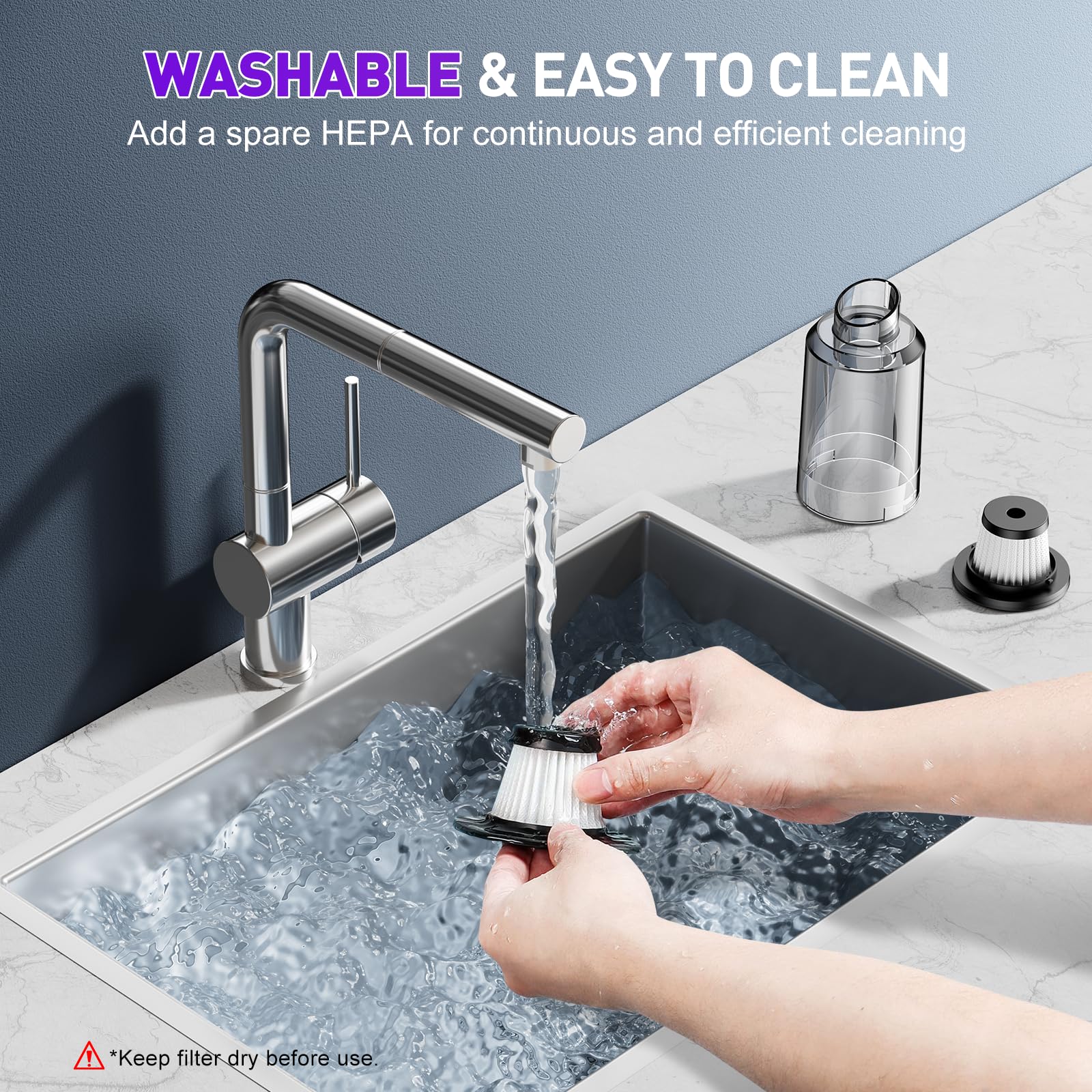 - đăEffortless MaintenanceăWith just one-click dismantling, you can easily dump garbage and clean the vacuum cleaner. The Hepa filter can be washed and reused, ensuring efficient suction power while keeping dust and dirt outside to prevent blockage