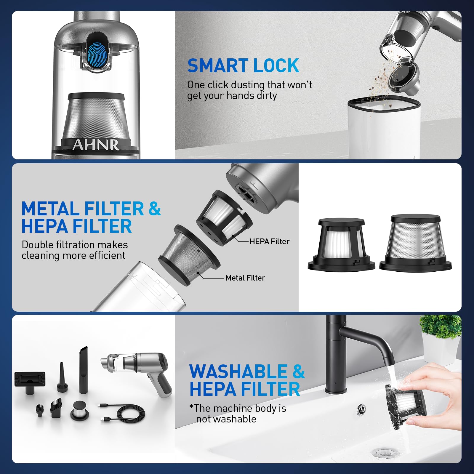 - đŽăDual Filtration SystemăThis hand held vacuum cordless is equipped with an upgraded dual-filter system. The metal filter effectively filters out larger impurity particles. The HEPA filter can trap extremely fine dust, and it can be easily cleaned and reused. Dual-filter system enables more efficient dust filtration and extends the service life of the vacuum. The one-touch cleaning design simplifies the cleaning processâjust a light press allows you to empty the garbage with one click