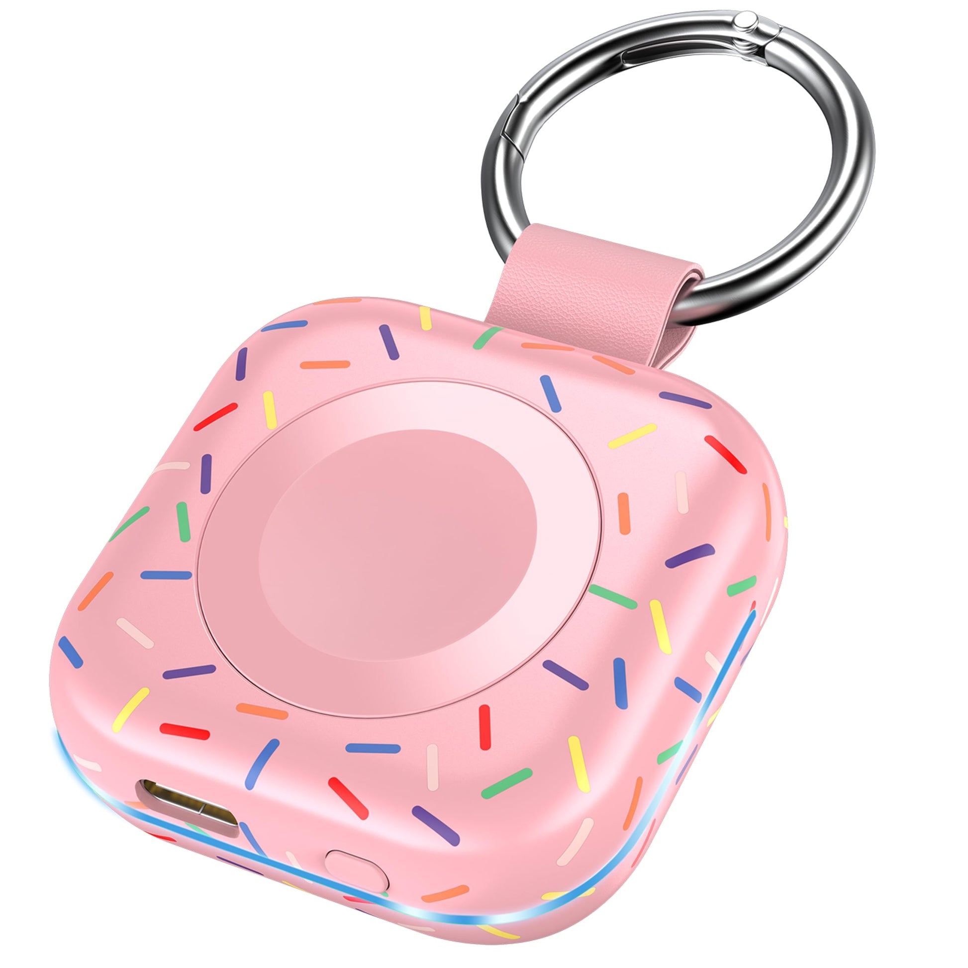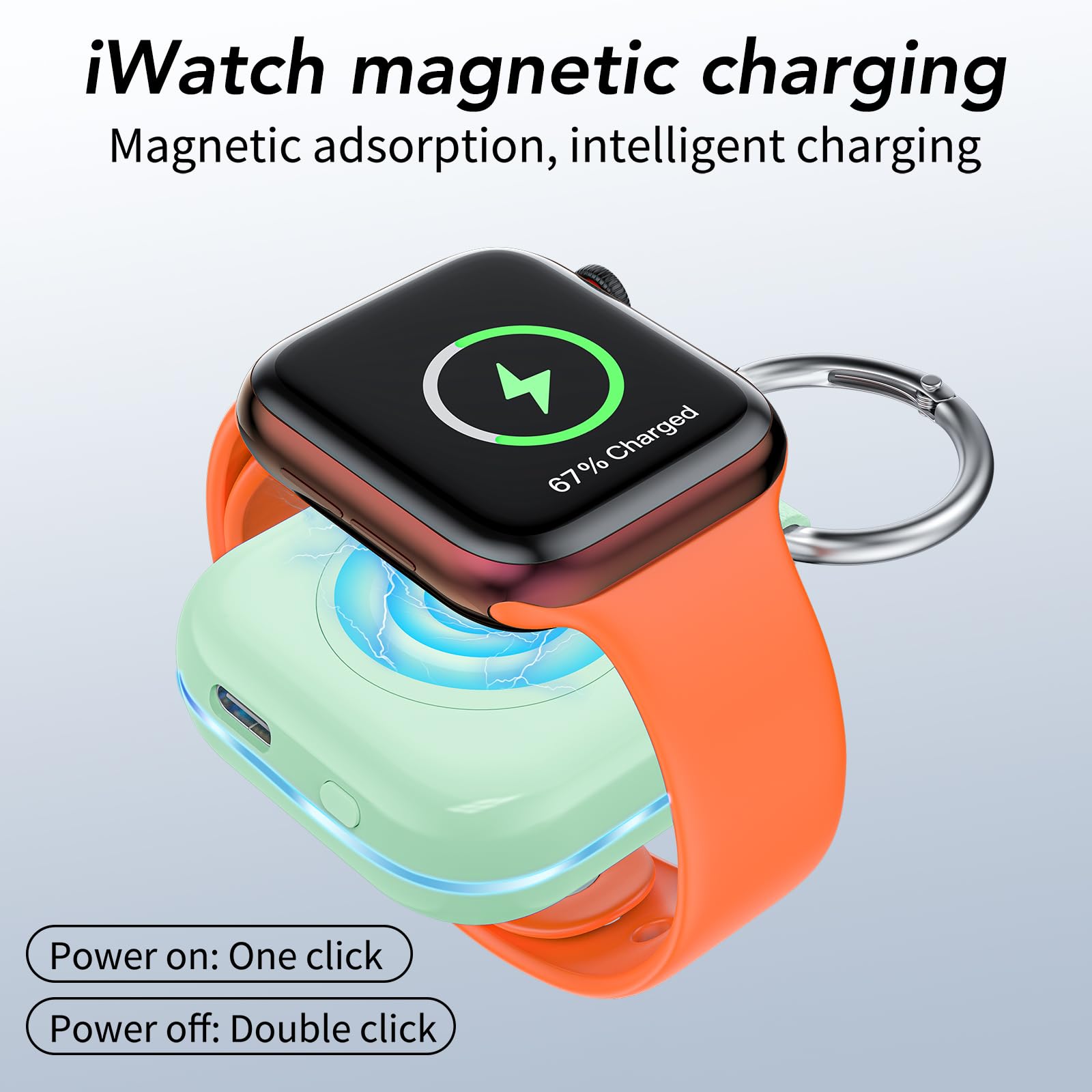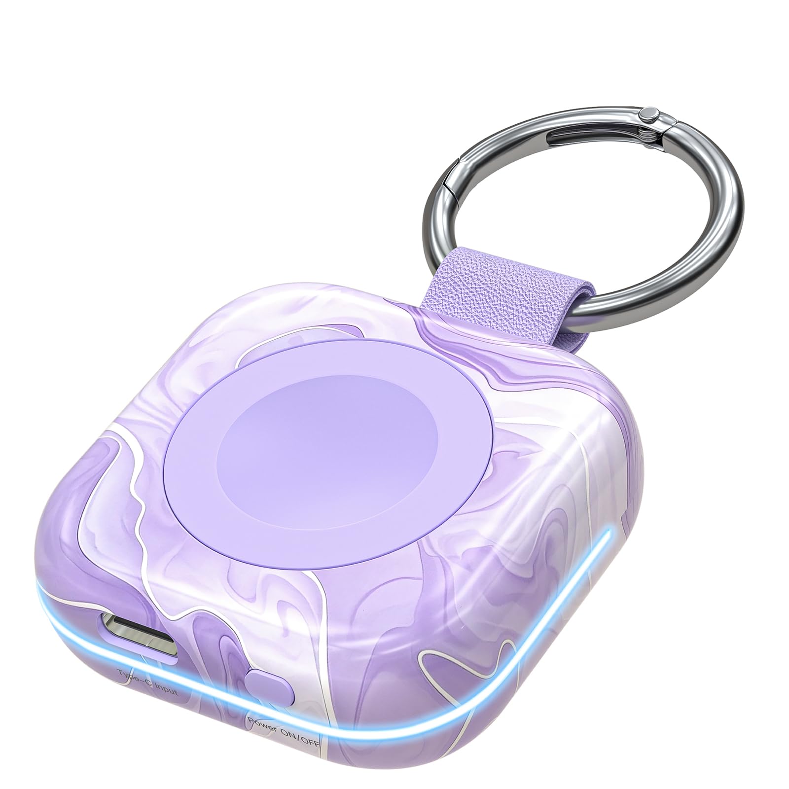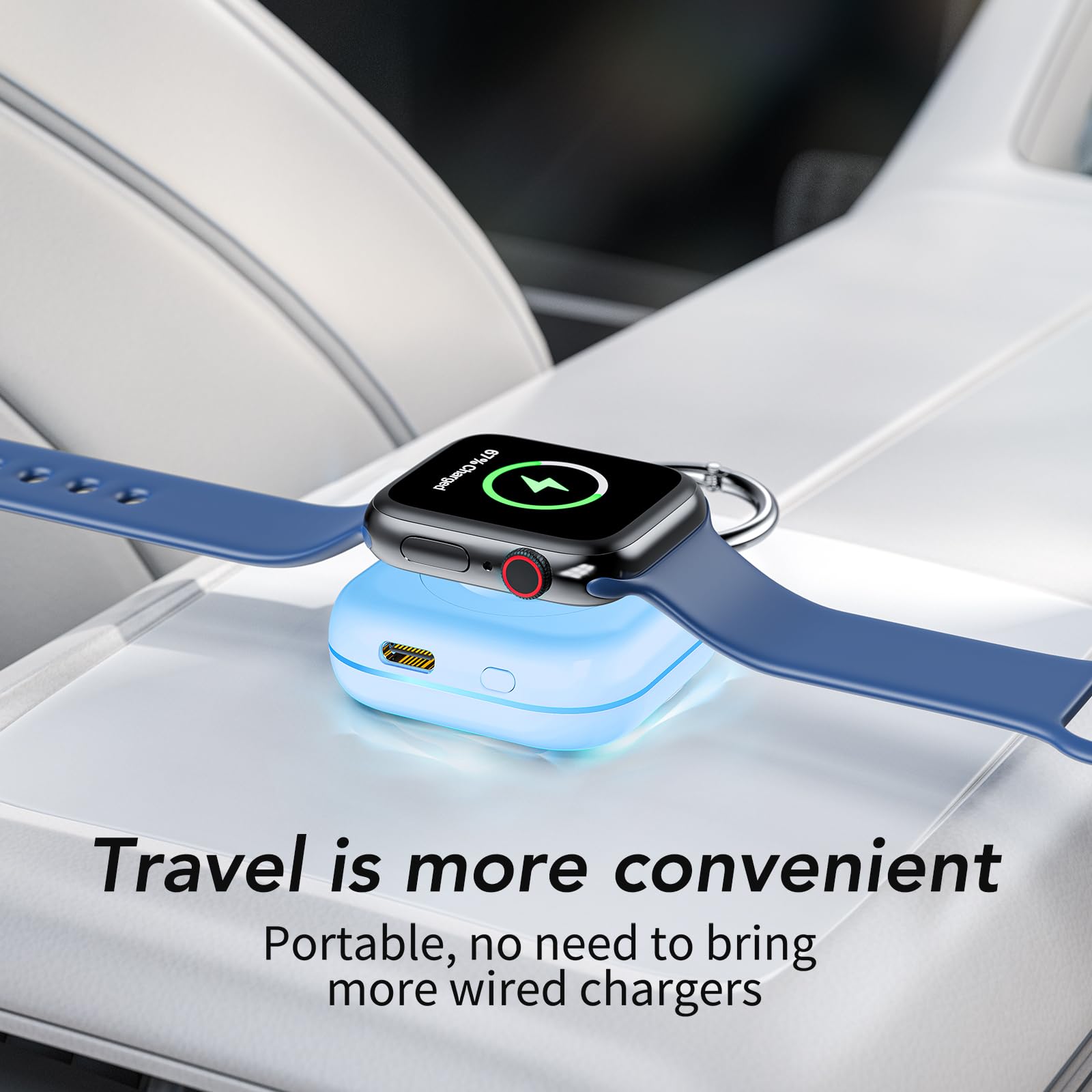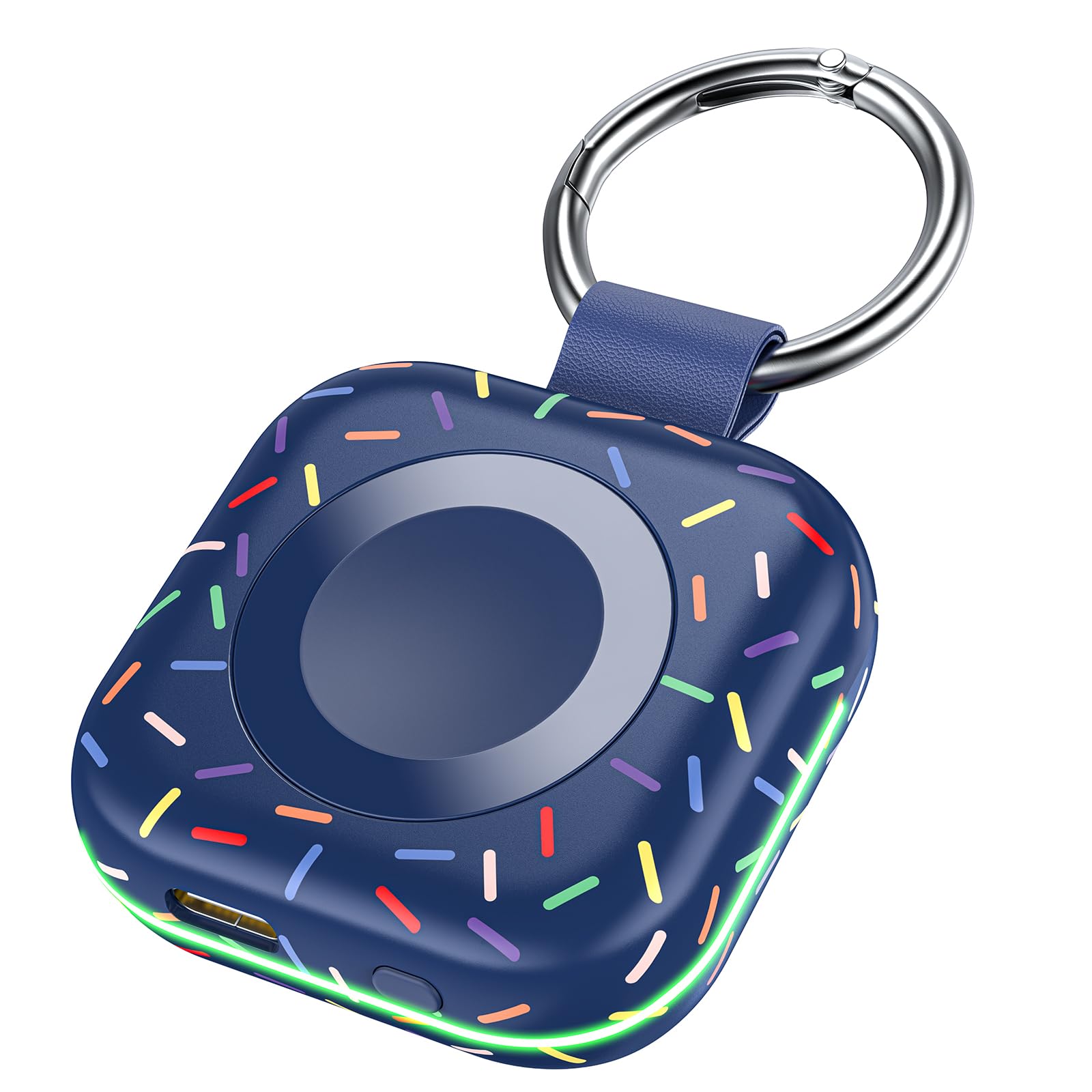 - Mini Compact: The size of the cute keychain portable charger for apple watch is about the size of your watch.The comfortable frosted feel makes people love it.New indicator light design(0-30% Red Light,30%-60% Blue Light,60%-100% Green Light), fashion, keychain design,Convenient for all kinds of travel