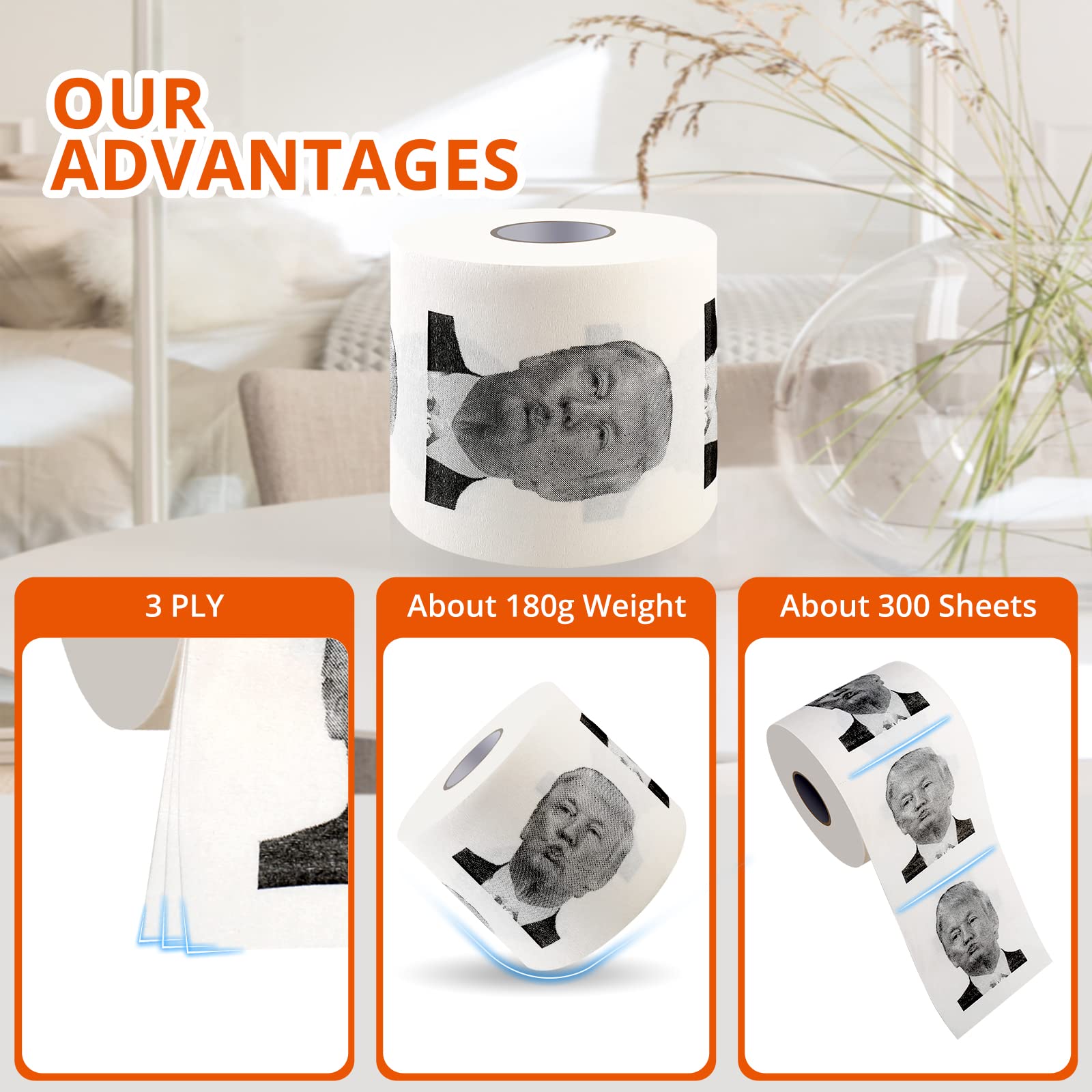- Novelty Gift: prank toilet paper is a conversation starter, a great gag gift idea for a true president hater, the intended purpose of the toilet humor is to have fun with it; It's a funny novelty gag for Democrats and Republicans; Whether you're laughing at Him or with Him, you're sure to stir up conversation; Great toilet gifts for a joke, especially for someone with a good sense of humor