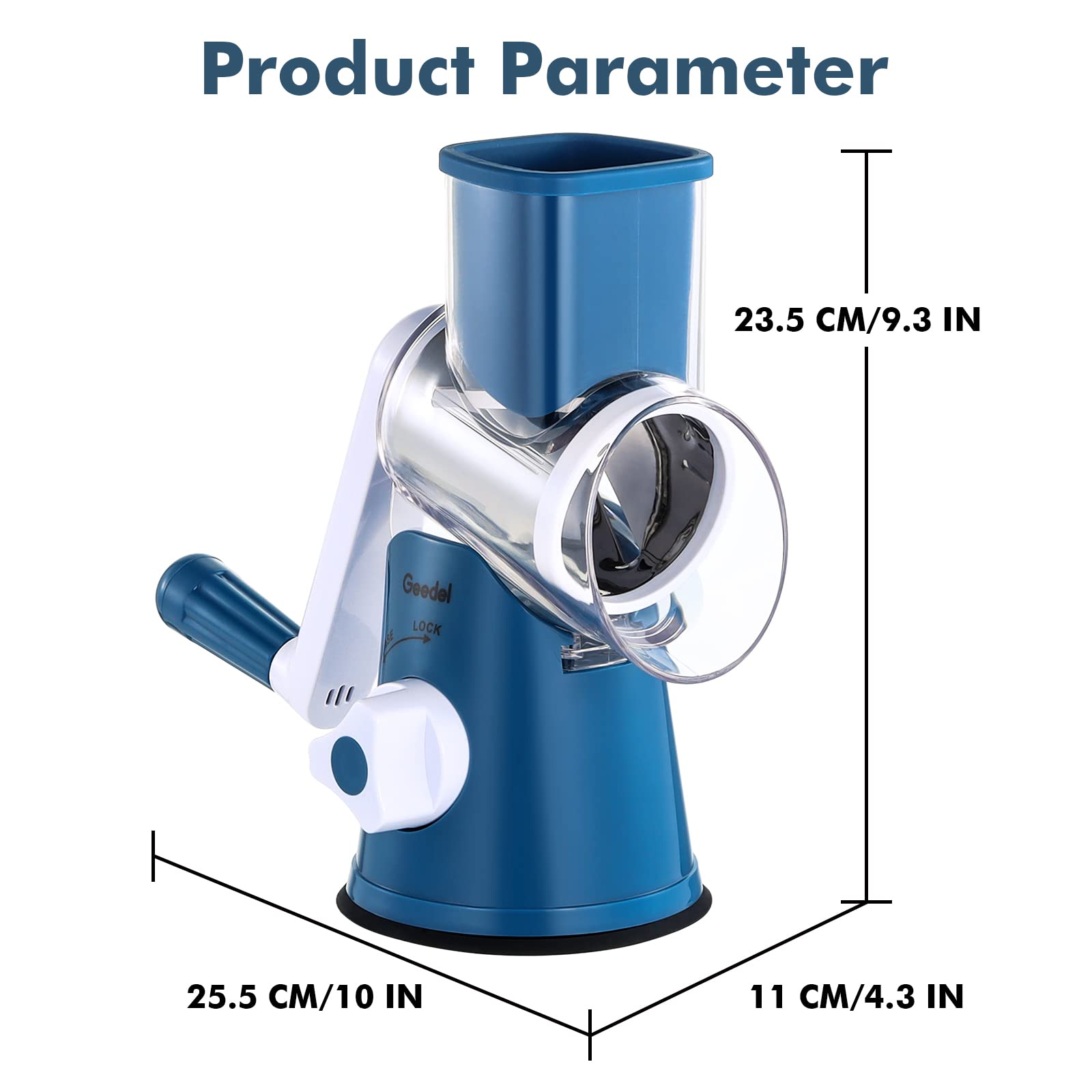- Premium Material : All parts of the rotary cheese grater are made of food grade ABS material, no BPA. The three blades are made of stainless steel, never dull or rust. Our rotary grater provides safe choice and ensures you can enjoy healthy food