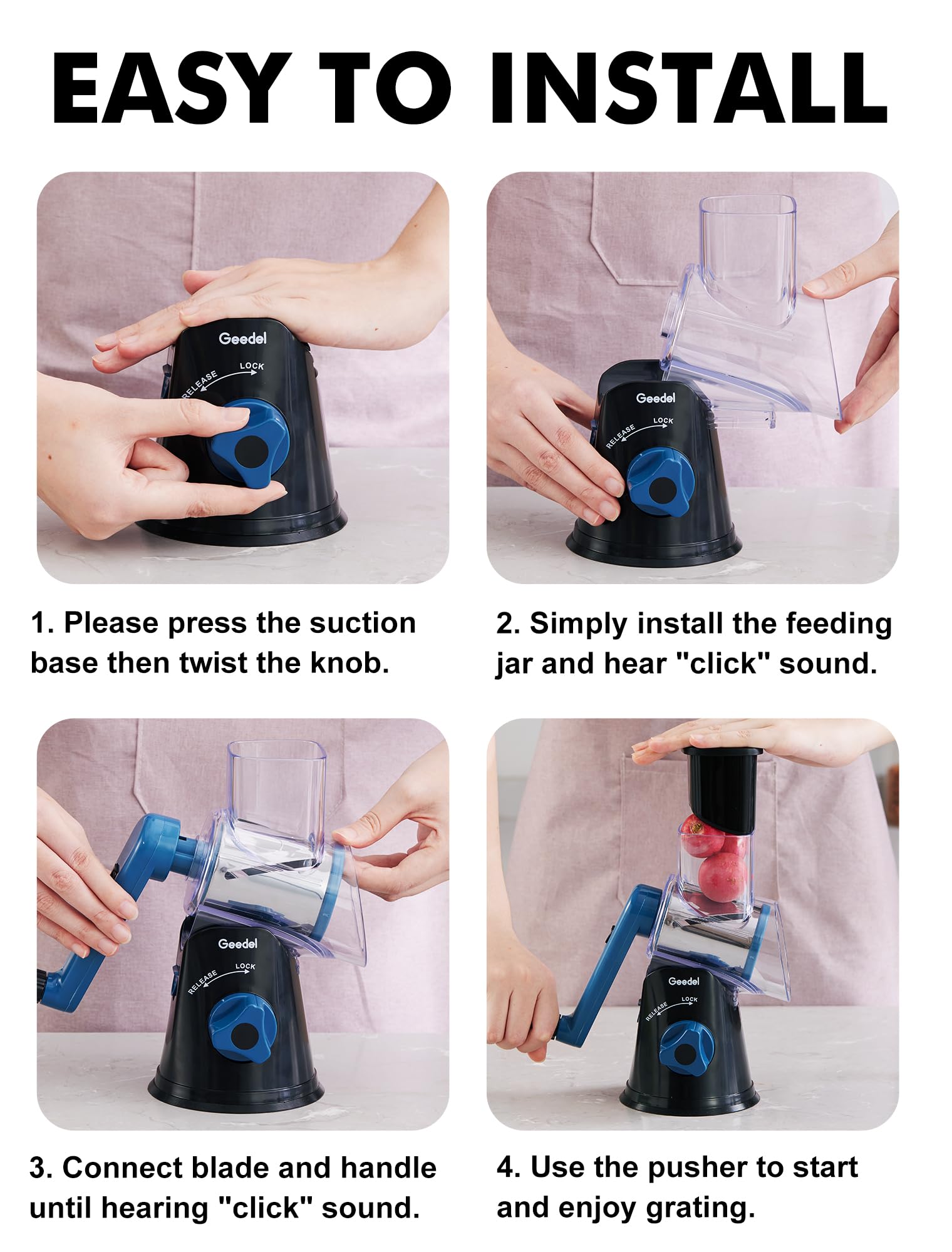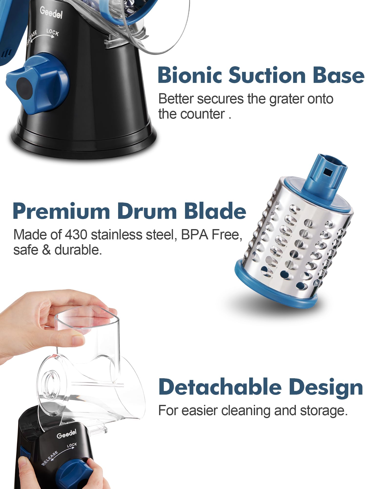 - Subtle Design : The powerful suction base keeps the cheese grater firm on a clean or smooth counter-tops like marble, glass. Plus, the transparent barrel with an inclined curvature reduce jamming in the cheese shredder