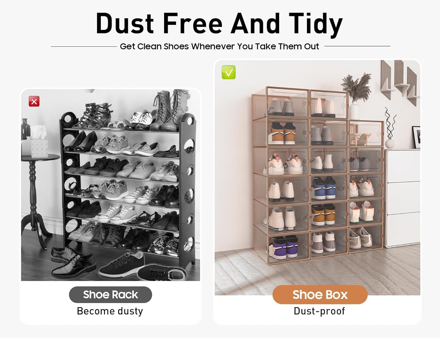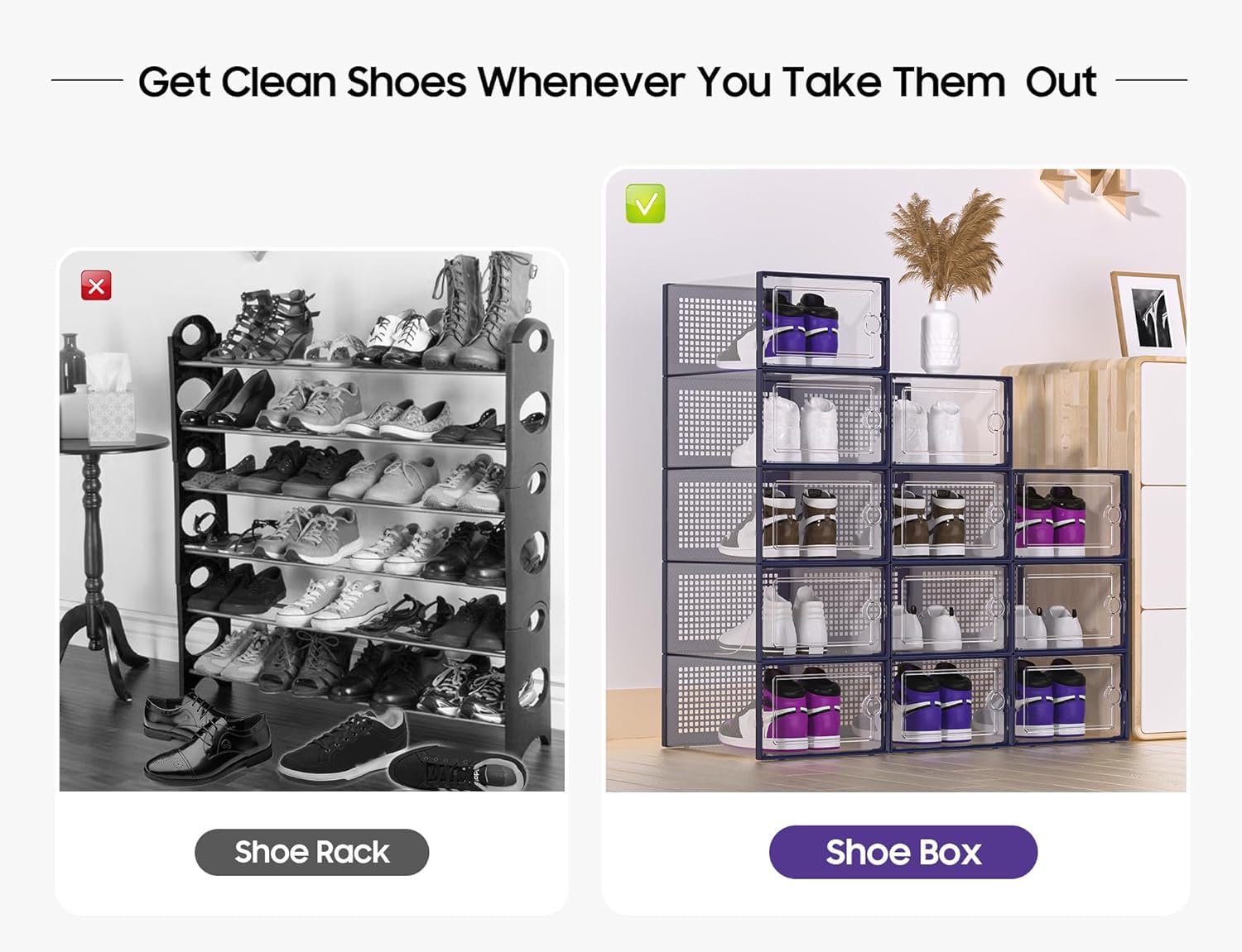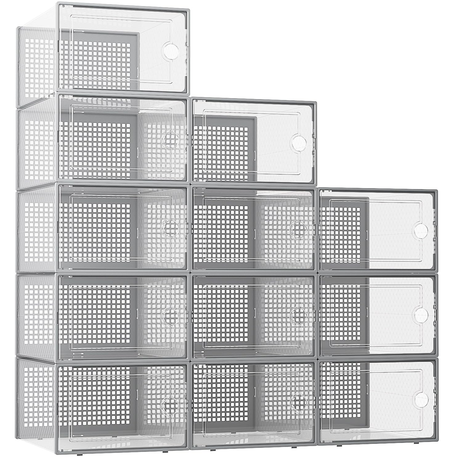 Shoe Storage Boxes Organizers Clear Plastic Stackable 12 Pack, Shoe Rack & Holder Substitute, Sneaker Containers, Toy Storage Organizer Bins for Entryway, Closet, Under Bed, Black