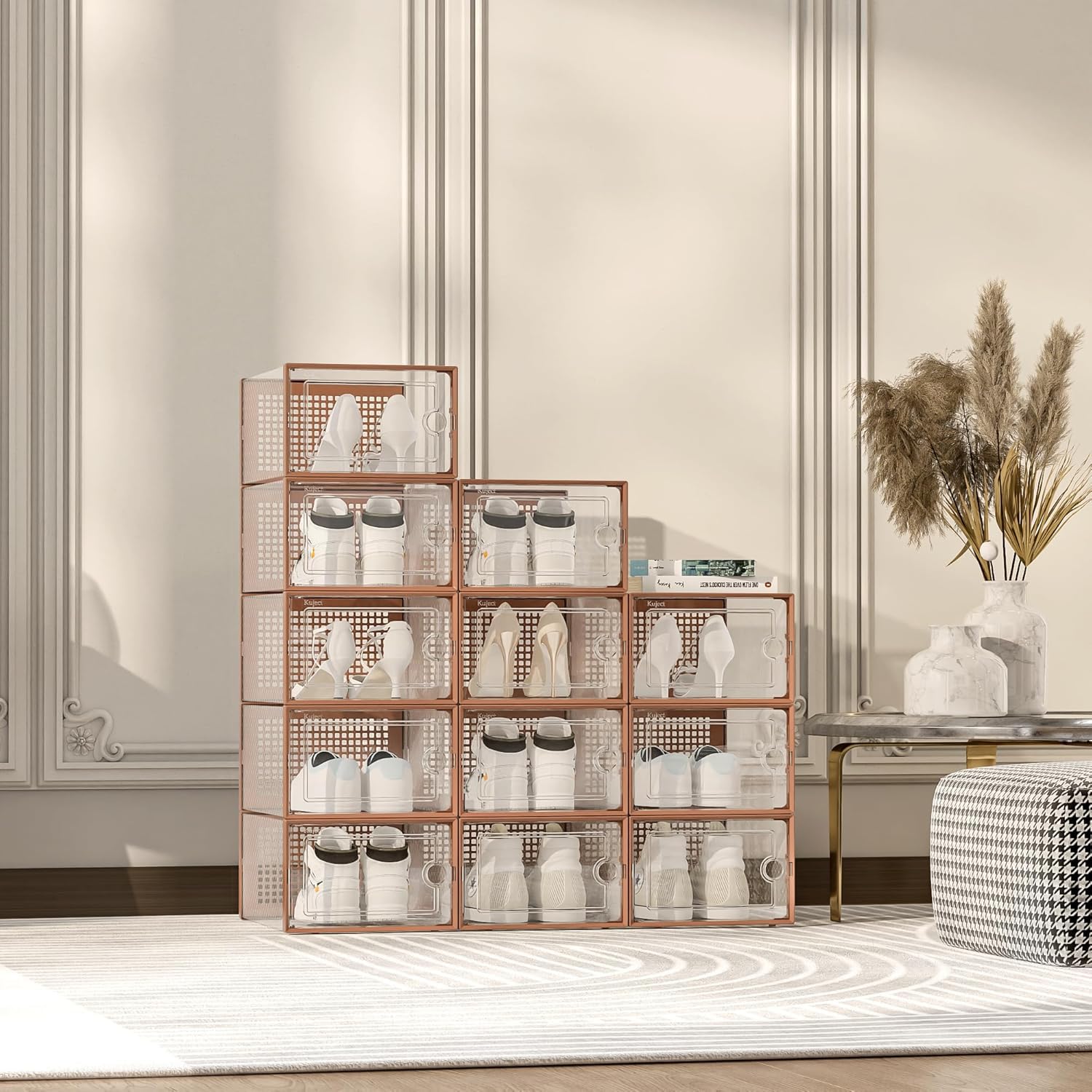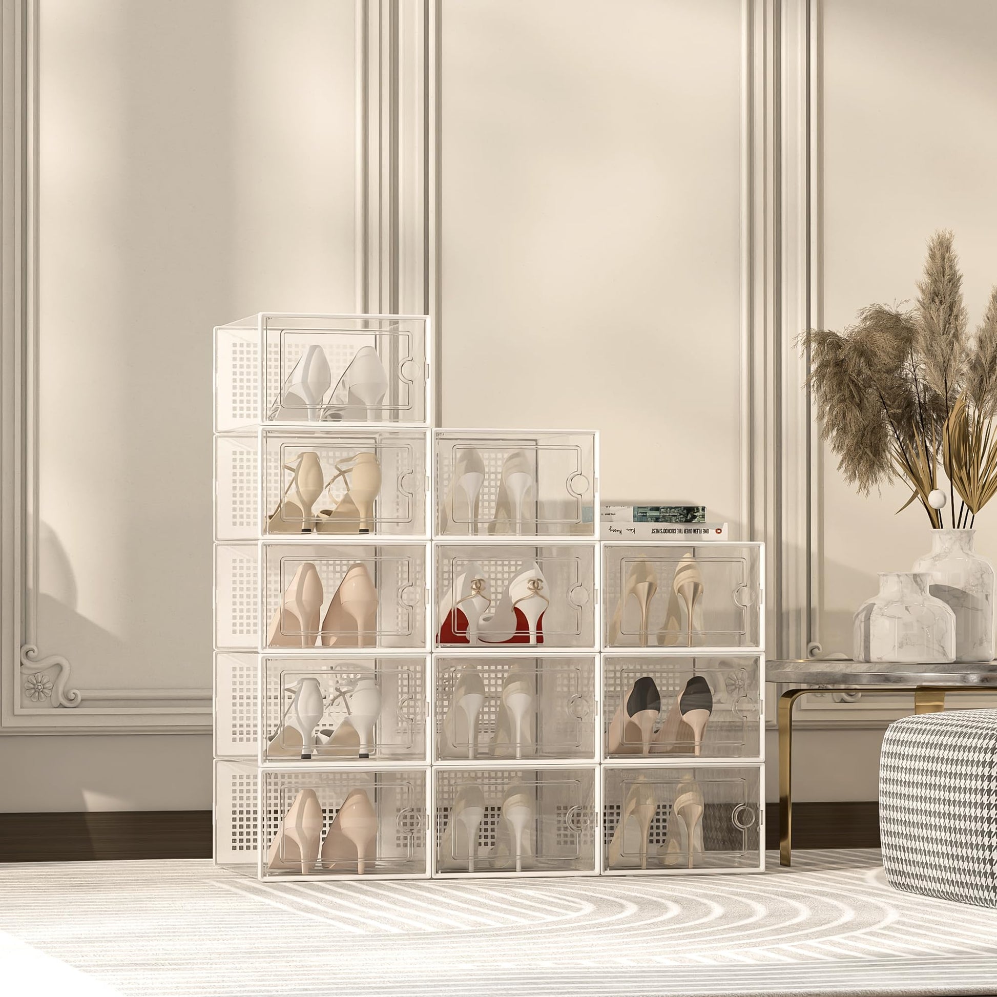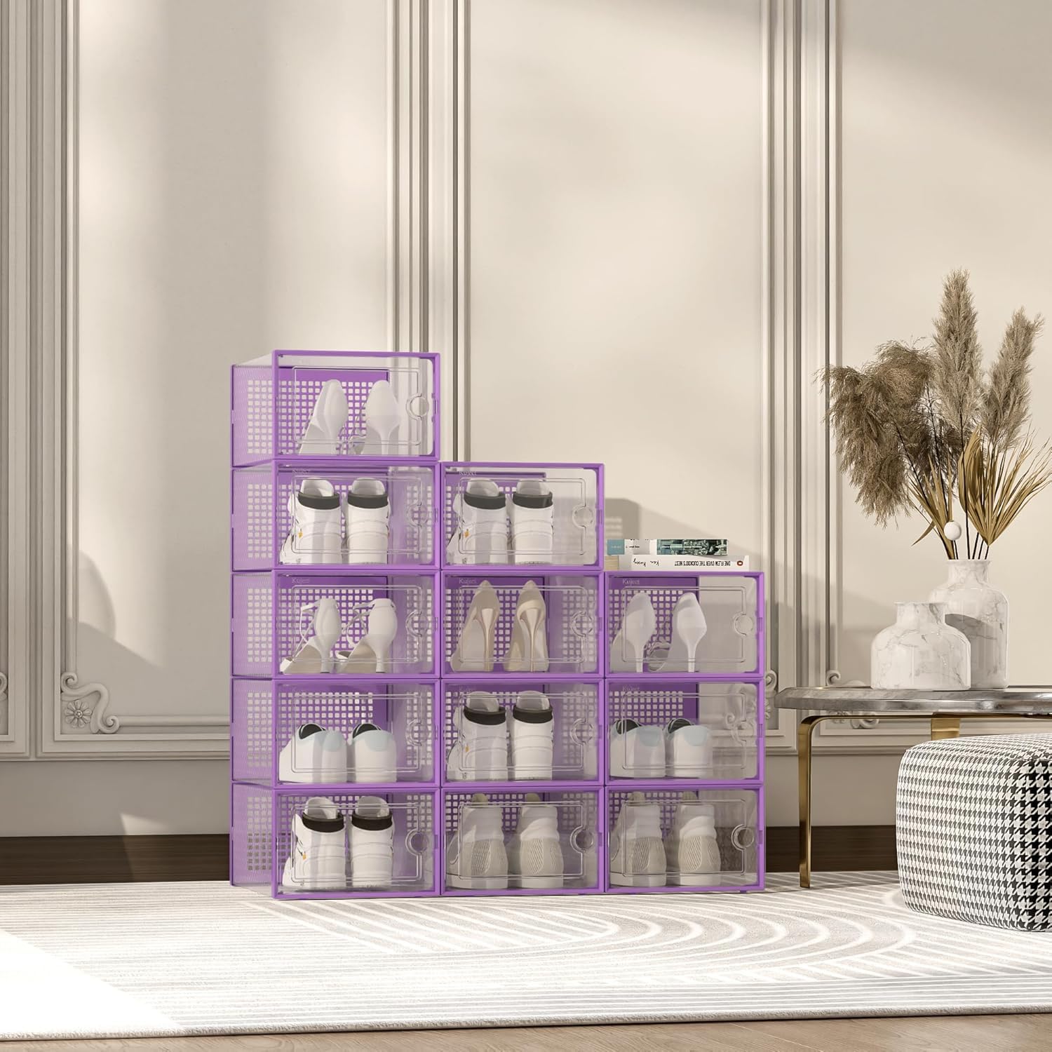 Shoe Storage Boxes Organizers Clear Plastic Stackable 12 Pack, Shoe Rack & Holder Substitute, Sneaker Containers, Toy Storage Organizer Bins for Entryway, Closet, Under Bed, Black