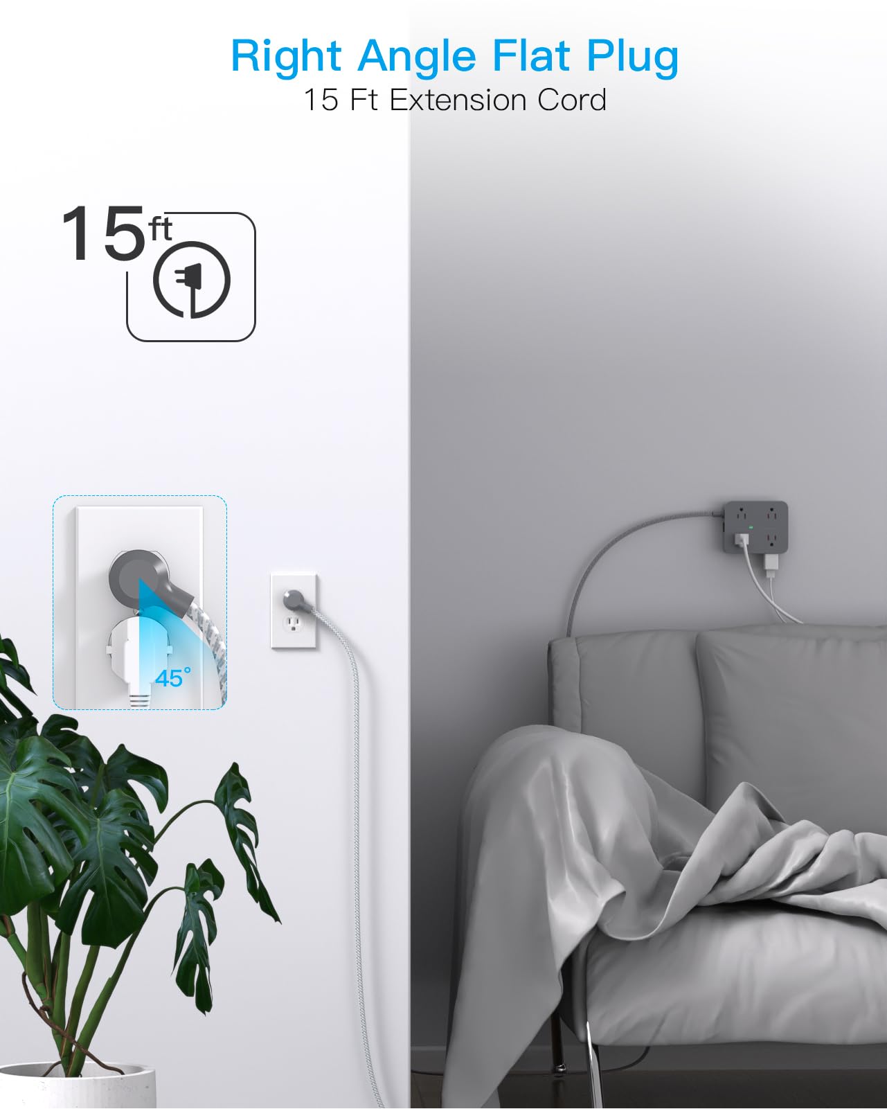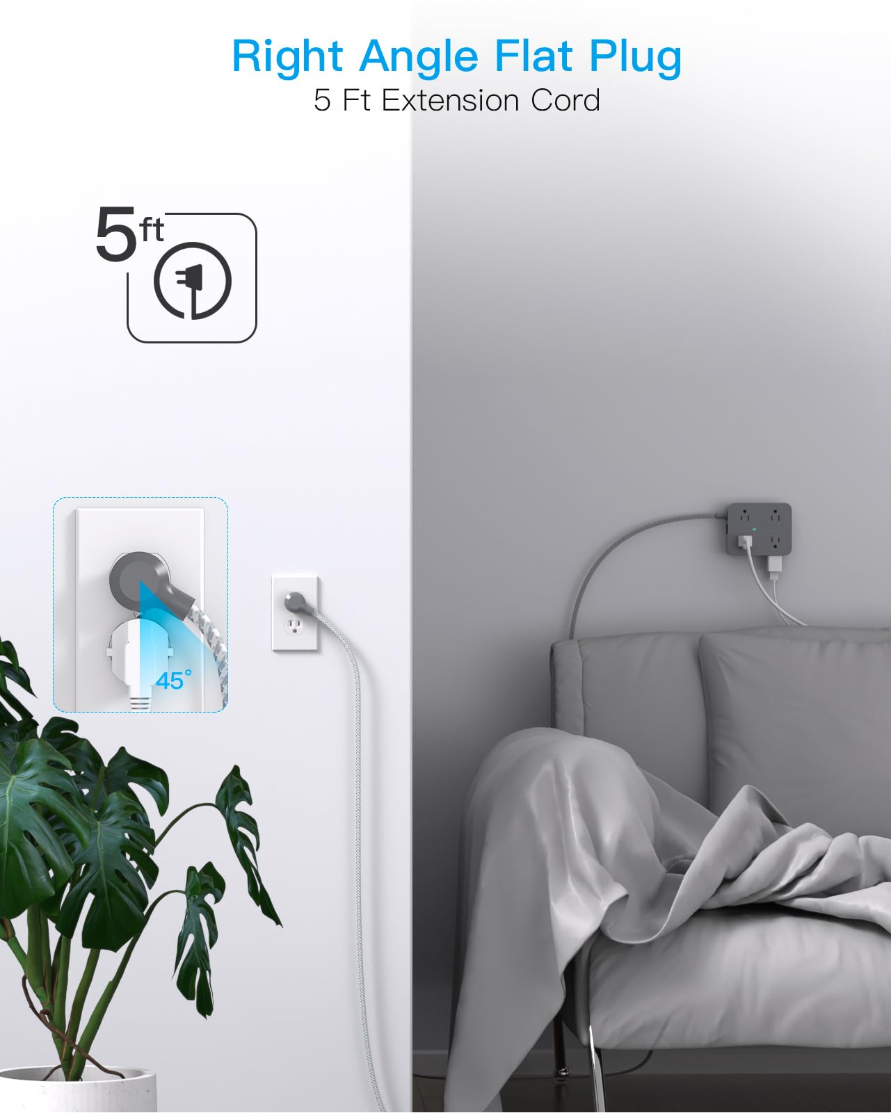 - 【Wall Mountable Extension Cord with Flat Plug】- The low-profile flat plug fits easily in tight spaces; and the right angle flat plug design prevents bottom plug blocking; the 5ft(included the plug) upgraded braided extension cord is very thick and has better current carrying capacity; the two mounting holes on back allows this power strip to be securely installed in various applications